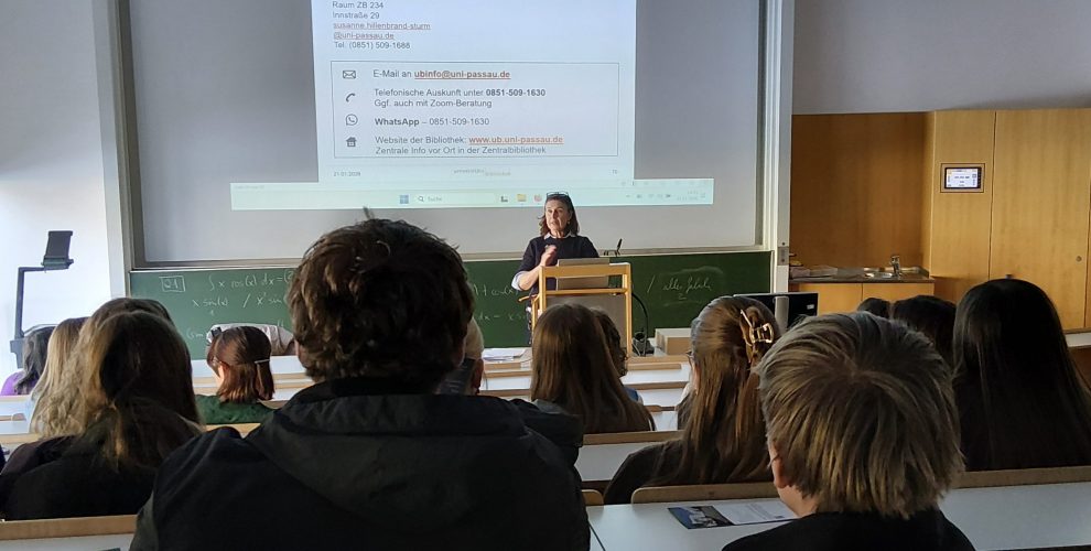 Nach dem gemeinsamen Mittagessen in der Uni-Mensa folgten noch zwei Vorträge. In dem ersten wurden die umfangreichen Studienangebote vorgestellt, die es in Passau gibt, im zweiten lernten die Schülerinnen und Schüler viel über die wissenschaftliche Literaturrecherche in der Bibliothek. Dies ist v.a. im Hinblick auf das anstehende Verfassen der W-Seminararbeiten von Bedeutung. Begleitet wurden der Studieninfotag von den vier Lehrkräften der W-Seminare: Karin Ittlinger, Gerald Kainz, Alfons Niederhofer und Kristina Pupeter.