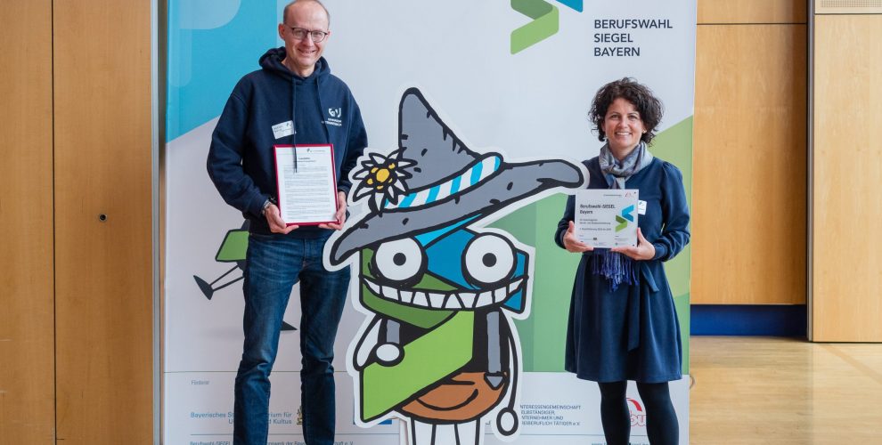 Die Auszeichnung mit dem Berufswahlsiegel wurde von Gerald Kainz (Koordinator für berufliche Orientierung) und Elisabeth Maier (ABO-Team) in Amberg, wo die Feierlichkeiten für die ausgezeichneten Schulen aus Niederbayern und der Oberpfalz stattfanden, entgegengenommen.
